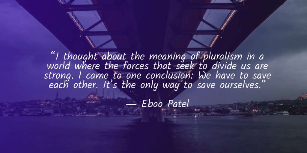 “I thought about the meaning of pluralism in a world where the forces that seek to divide us are strong. I came to one conclusion: We have to save each other. It’s the only way to save ourselves.” — Eboo Patel